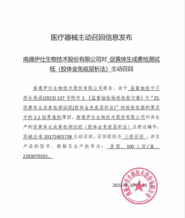 該產(chǎn)品是一種定性的輔助診斷檢測(cè)試紙,不會(huì)對(duì)人體造成傷害、不存在安全隱患,該批次產(chǎn)品至今未收到相關(guān)不良事件反饋。本著對(duì)消費(fèi)者負(fù)責(zé),對(duì)市場(chǎng)負(fù)責(zé)的態(tài)度,公司發(fā)布了主動(dòng)召回信息,涉及產(chǎn)品:促黃體生成素檢測(cè)試紙(膠體金免疫分析法),條型100人份/盒,生產(chǎn)批號(hào)2203070201。若您有任何問(wèn)題,可聯(lián)系電話:13390988885。